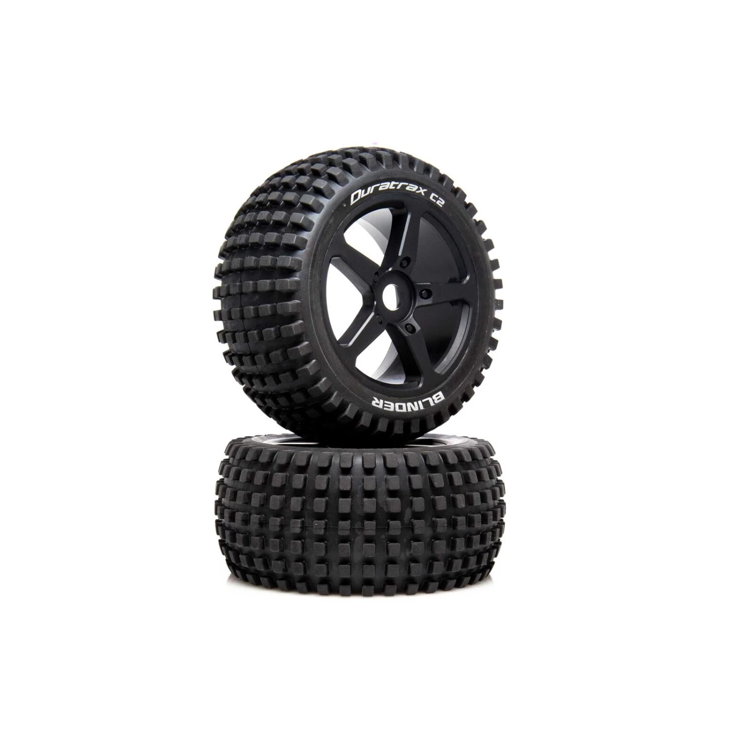 Factory-mounted with zero offset, these Duratrax® BLINDER™ front/rear tires for 1/8 scale truggies feature a tread pattern that’s ideal for a wide variety of surfaces — hard-packed dry and wet tracks, grass, mud, and loose, dry and loamy surfaces. The wheels are molded from a durable black composite plastic with a 17mm hex and 2.6 inch (66.2mm) width. The tires are made from high-traction, C2 soft compound and are 5.3 inches (146mm) in diameter. Sold in pairs.