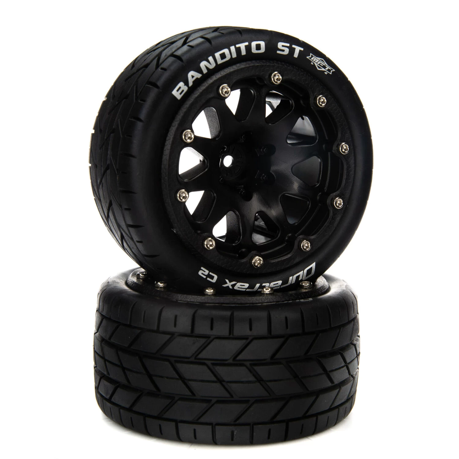 Factory-mounted, these Duratrax® BANDITOâ„¢ ST front/rear tires for the 1/10 scale ARRMA® GRANITEâ„¢ 4X4 BLX Monster Truck feature a tread pattern that’s perfect for running on pavement, hard-packed clay, and similar conditions. Molded from a durable black composite plastic, the 14mm hex wheels measure 2.8 inches (56.3mm) wide and 4.7 inches (119.1mm) in diameter. The belted tires include one-piece foam inserts and white sidewall markings, and are made from high-traction C2 soft compound. Sold in pairs.