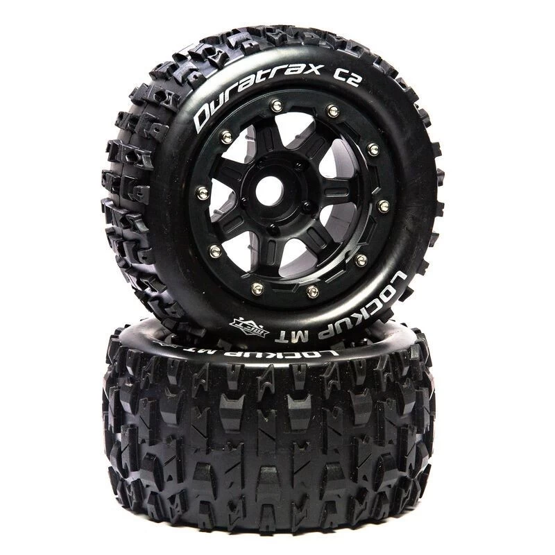 For running on a wide variety of surfaces: pavement, loose dry loamy dirt, loose wet mud, and hard-packed wet or dry grass Duratrax offers these factory mounted 1/10 scale LOCKUP MT Belted front/rear tires for the Traxxas MAXX and similar monster trucks. Molded from durable composite black plastic, the 17mm hex wheels measure 2.8 inches (70.2mm) wide and 5.4 inches (136.9mm) in diameter with a ½-inch wheel offset. The belted tires include one-piece foam inserts and are made from high-traction C2 soft compound. Sold in pairs.
